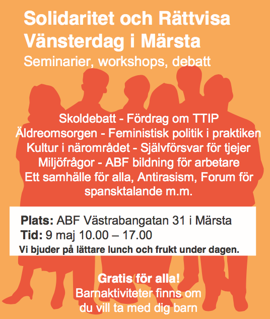 Solidaritet och Rättvisa Vänsterdag i Märsta – Seminarier, workshops, debatt, – Skoldebatt – Fördrag om TTIP Äldreomsorgen – – Feministisk politik i praktiken , Kultur i närområdet – Självförsvar för tjejer, Miljöfrågor – ABF bildning för arbetare – Ett samhälle för alla, Antirasism, Forum för spansktalande m.m.